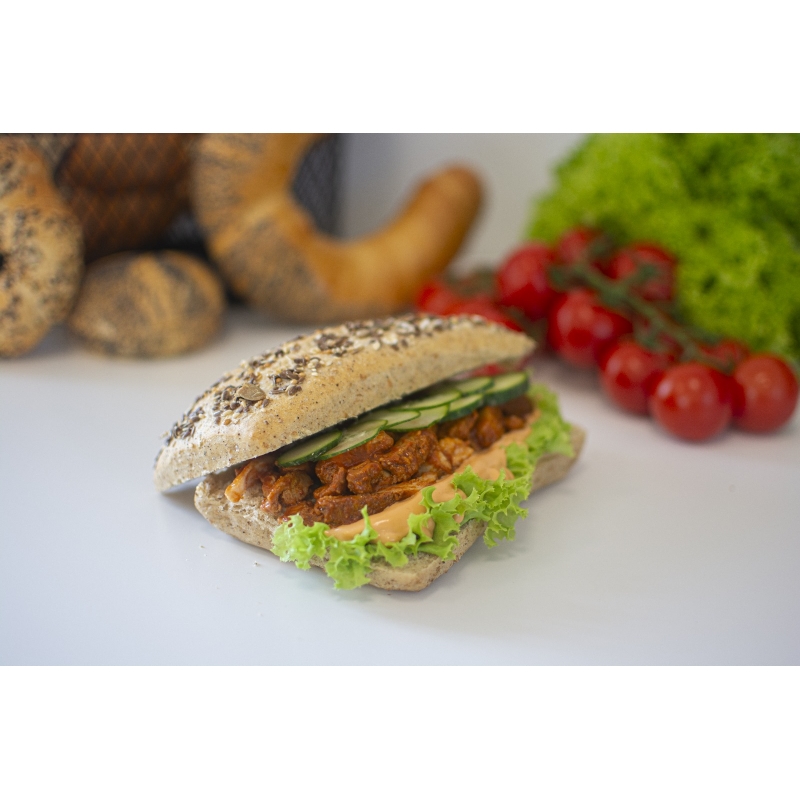 Składniki: Bułka pszenna z ziarnami (mąka pszenna, zakwas pszenny, sól, gluten pszenny, ekstrakt słodowy, błonnik roślinny, słód pszenny, drożdże, olej, woda, ziarna soi, ziarna słonecznika, pestki dyni, siemię lniane, płatki owsiane) (20%), Karkówka wieprzowa (8%), JOGURT GRECKI, Ogórek (5%), Mix sałat (Sałata lodowa, Sałata rzymska, Endywia kędzierzawa, Cykoria czerwona), Sos Sriracha (Chilli 61%, woda, czosnek, sól, regulatory kwasowości (kwas octowy, kwas cytrynowy) (8%), przyprawy), Majonez domowy (olej rzepakowy, PASTERYZOWANE ŻÓŁTKA JAJ, MUSZTARDA), Sok z limonki, Sos BBQ (woda, cukier, koncentrat pomidorowy, ocet spirytusowy, ocet winny biały, skrobia, przecier śliwkowy, przyprawy, sól), Musztarda (woda, ocet spirytusowy, GORCZYCA, cukier, sól, przyprawy), Olej rzepakowy, Sos SOJOWY jasny (woda, ziarno SOI, sól, ocet spirytusowy), Czosnek, Pieprz czarny, Sól, Sól morska, Woda
