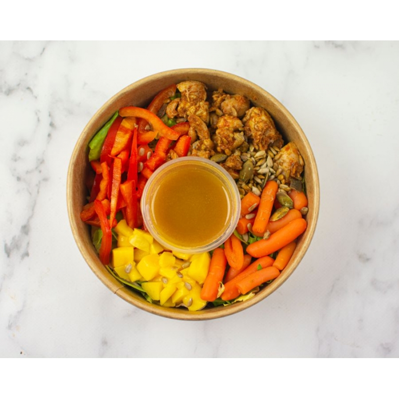 Sałatka azjatycka z kurczakiem chilli, mango i sosem fistaszkowym.
