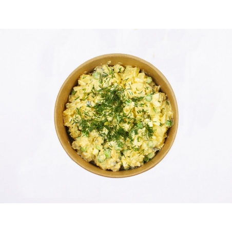 Składniki: Ziemniaki (43%), JAJA KURZE Gotowane i Obrane (Woda, Sól, Regulatory Kwasowości: Kwas Cytrynowy, Kwas Octowy, Kwas Mlekowy) (19%), Ogórki Kiszone (Ogórki, Woda, Sól, Przyprawy W Tym GORCZYCA) (14%), Majonez Domowy (Olej Rzepakowy, Pasteryzowane Żółtka JAJ, Musztarda (GORCZYCA)), Groszek Zielony (9%), Musztarda (Woda, GORCZYCA, Ocet Spirytusowy, Sól), Cebula Biała, Pieprz Czarny, Sól, Koper (1%) Ogrodowy